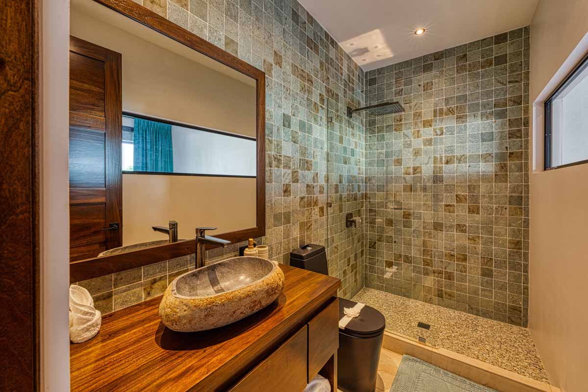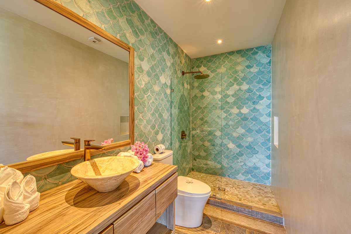 This brand new house has a spectacular spacious upper floor master bedroom with wrap around private balcony, four poster bed, double shower all with 180 ocean views and intimate outdoor Jungle bathroom with secluded bath-tub.