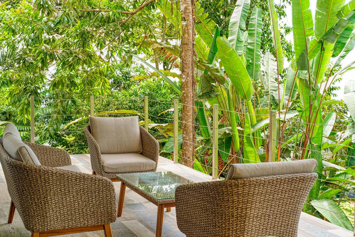 The living area is open plan lounge, kitchen and dining room, it is perfectly designed for the tropics as it opens up to a huge outside terrace with a comfortable sofa, large outdoor dining area and king size hanging bed, a comfortable place to relax and watch the toucans & macaws fly by.