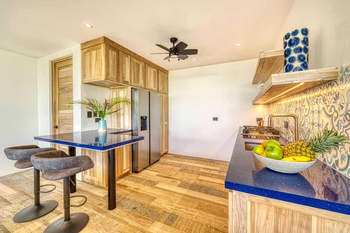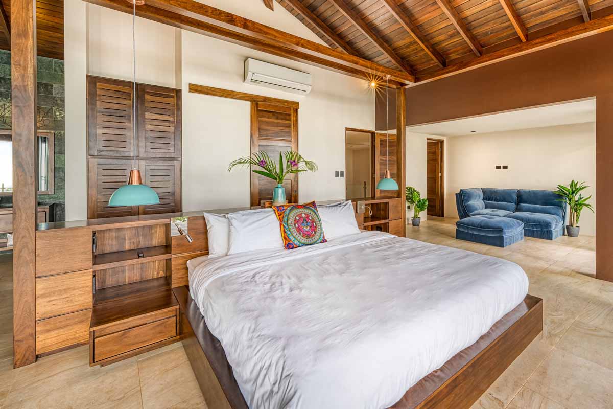The villa has two further upper floor bedrooms one with a king-size bed and one with a queen bunk bed both en-suite with ocean views and private balconies.
