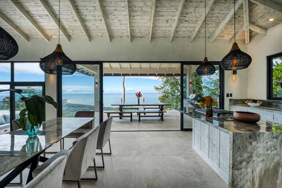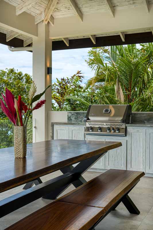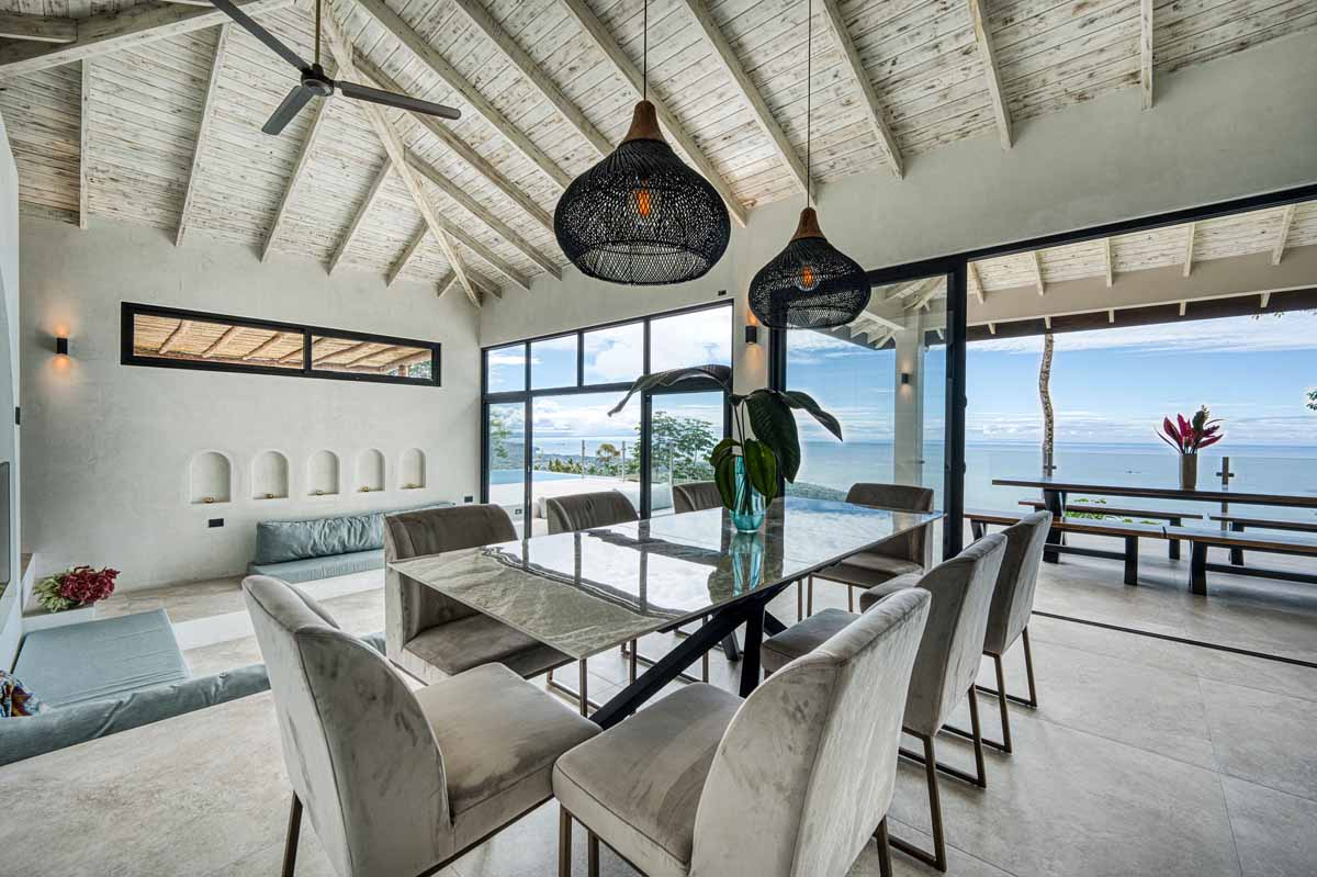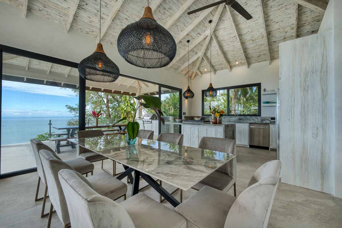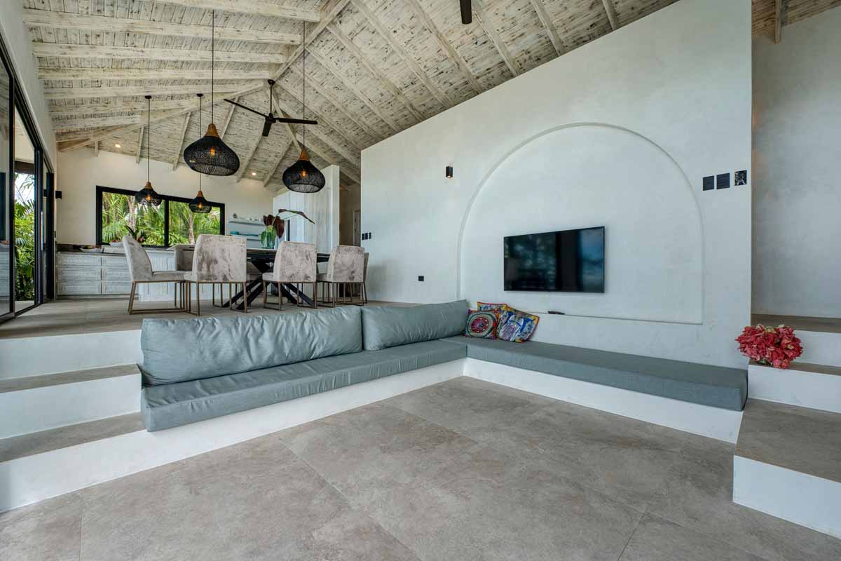 The living area has an open plan lounge, kitchen, and dining room, it is perfectly designed for the tropics as it opens up to a huge outside terrace with a comfortable sofa, a large outdoor dining area, a comfortable place to relax and watch the toucans & macaws fly by.